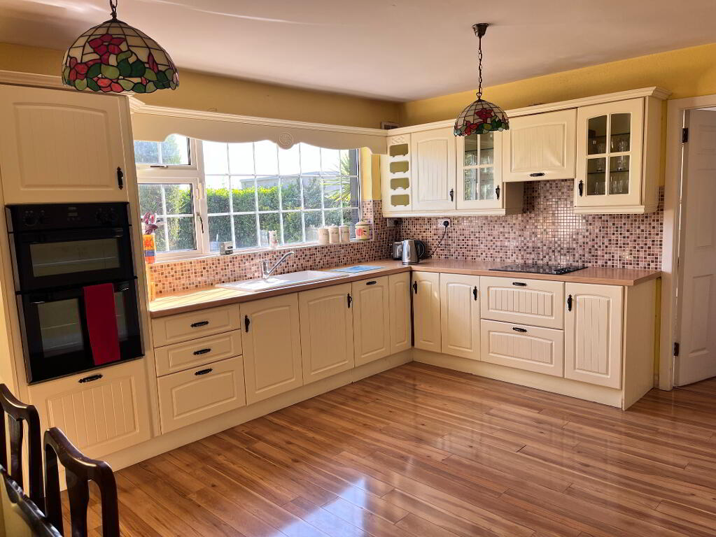 Kitchen: 5.4m x 3.98m: Cream painted kitchen units, built in oven and hob. Tiled splash back.