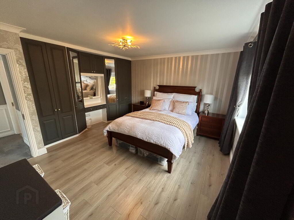 Master bedroom: 4.27m x 3.48m-laminate, built-in wardrobes (BIW), radiator cover, ensuite with electric shower, whb over vanity and wc. 01m x 1.42m.