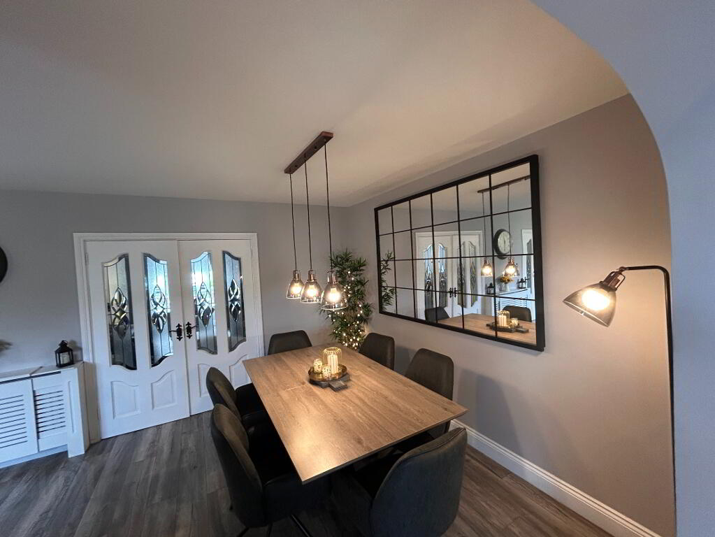 22 The Lawn, The Highlands, is a beautifully presented three-bedroom semi-detached home tucked away at the end of a quiet cul-de-sac, overlooking a large green. Maintained to an exceptional standard by its current owners, this property offers a perfect balance of modern comfort and versatile living space. The bright and well-proportioned accommodation includes a welcoming entrance hall with tasteful panelling and guest toilet, leading to a spacious sitting room with an attractive bay window. Double doors open into a superb open-plan kitchen, dining and living area, ideal for both family life and entertaining.