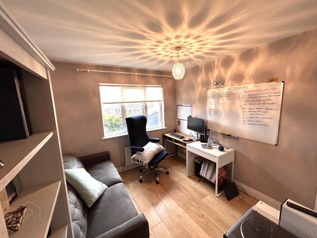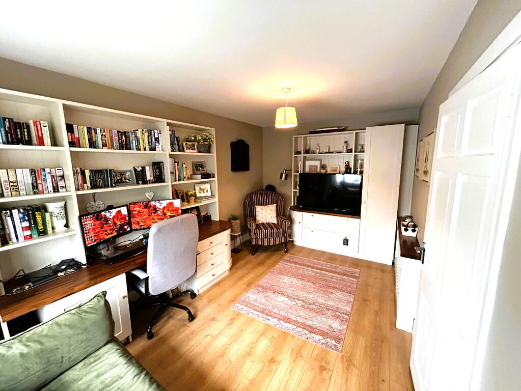 Sitting room/reception: 4.55m x 2.84m - Laminate, handmade built-in cabinets.