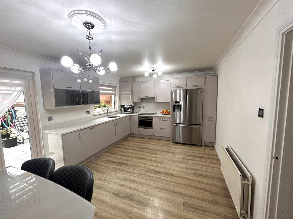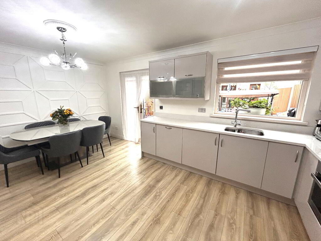 • Kitchen/ dining: 5.1m x 3.51m - Laminate, feature panelled wall, quartz worktops, range of fitted wall & floor units, water softener, filter tap, dishwasher, plumbed American Fridge Freezer, patio doors to back garden.
