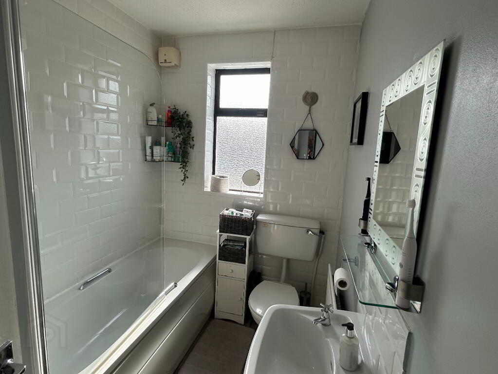 At first floor level, there are 2 no. bedrooms, both of which have built-in wardrobes. The family bathroom has part tiled walls