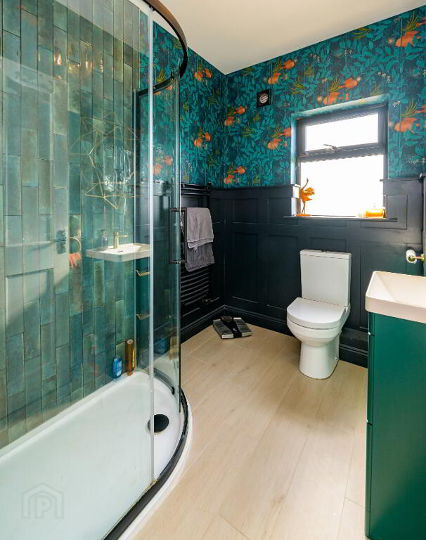 • Downstairs bathroom: partially tiled, shower, wc, whb over vanit, feature wallpaper.