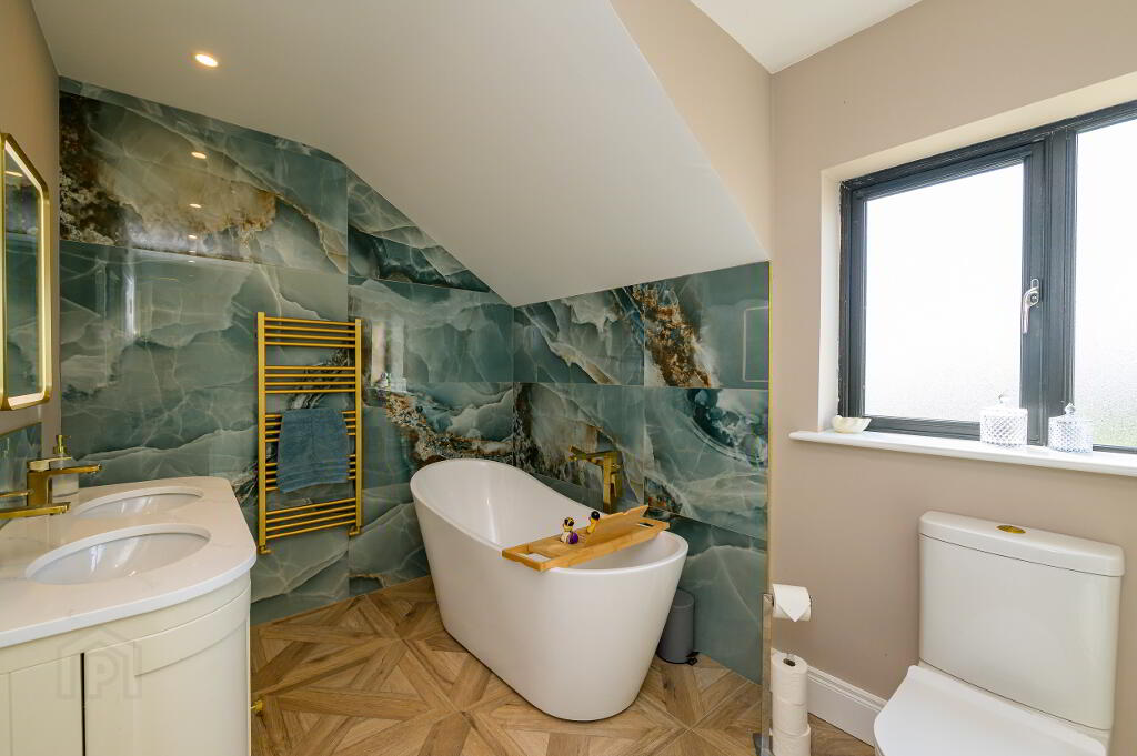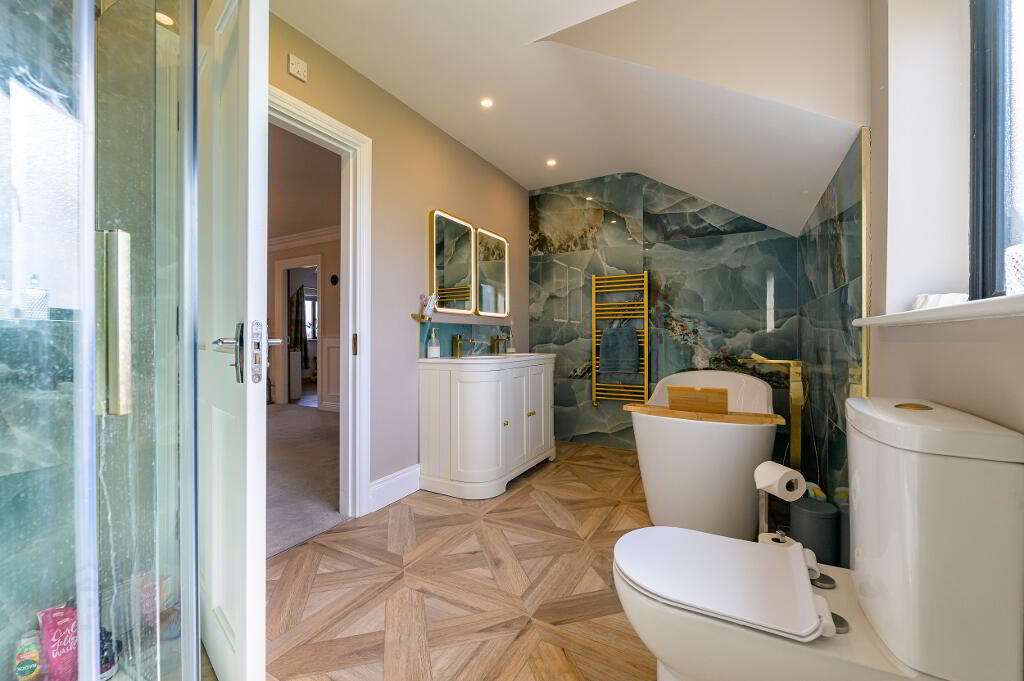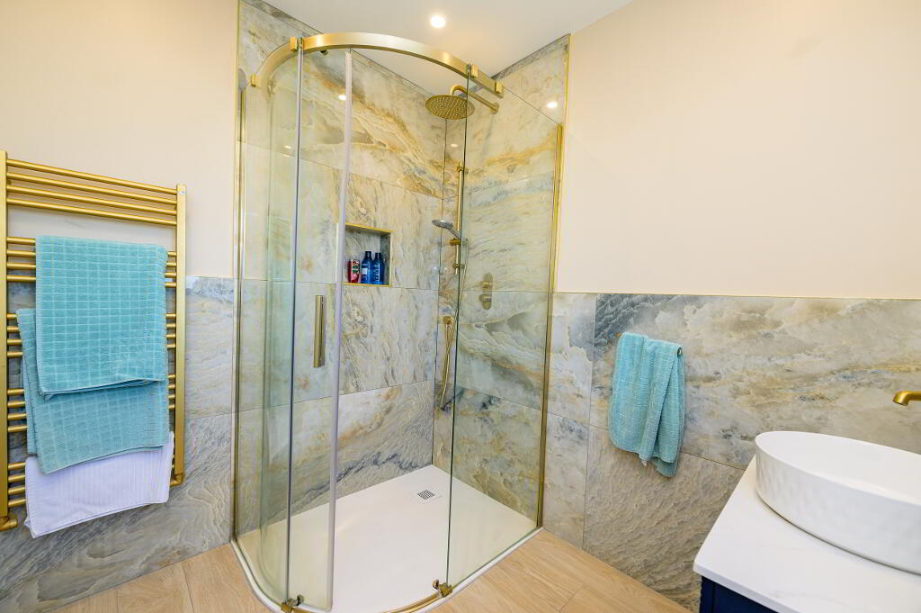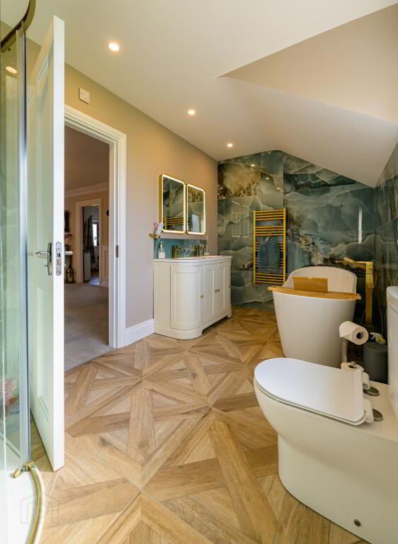 • Family bathroom: 2.1m x 4.1m. Partially tiled, freestanding bath, separate large shower, wc, whb, heated towel rail.